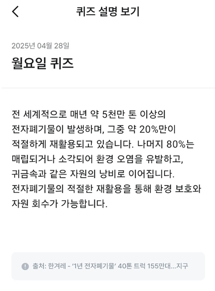카테고리 없음 경기도 기회 소득 퀴즈 (4월 28일 ) 전자폐기물, 5천만톤 by 비전99 2025. 4. 28. 반응형 오늘도 퀴즈 풀기 해볼까요? 전세계적으로 매년 약 5천 만톤이 맞을까 헷갈렸는데 누구나 맞추라고 내는 문제여서인지 함정은 없었네요. 오늘의 정답은 그렇다입니다. 반응형 공유하기 게시글 관리 비전99